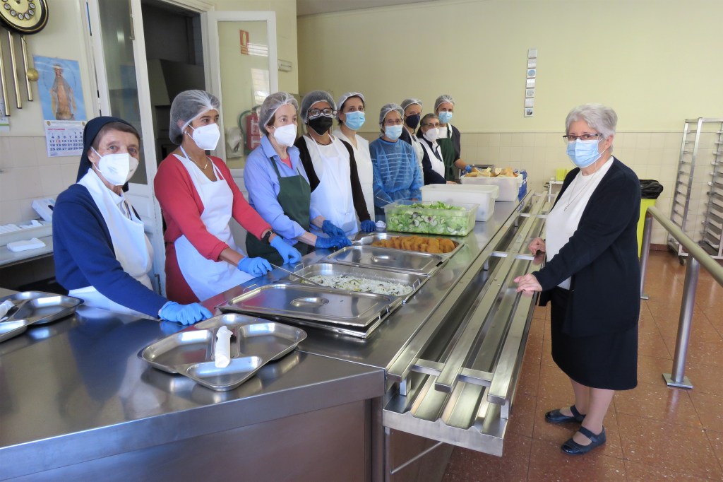 En 2020, el equipo que lidera la religiosa y que está formado por 23 trabajadores, siete hermanas y unos 60 voluntarios, atendió a 1.834 personas, mientras que en 2021 la cifra se redujo tan solo hasta 1.600 beneficiarios. Además de dar de comer a diario a una media de 300 adultos en dos turnos y con bolsas de comida para los que no caben en el comedor, en el turno de las once de la mañana van unas 90 familias con menores a recoger comida elaborada para todo el día y que calientan posteriormente en sus casas.
