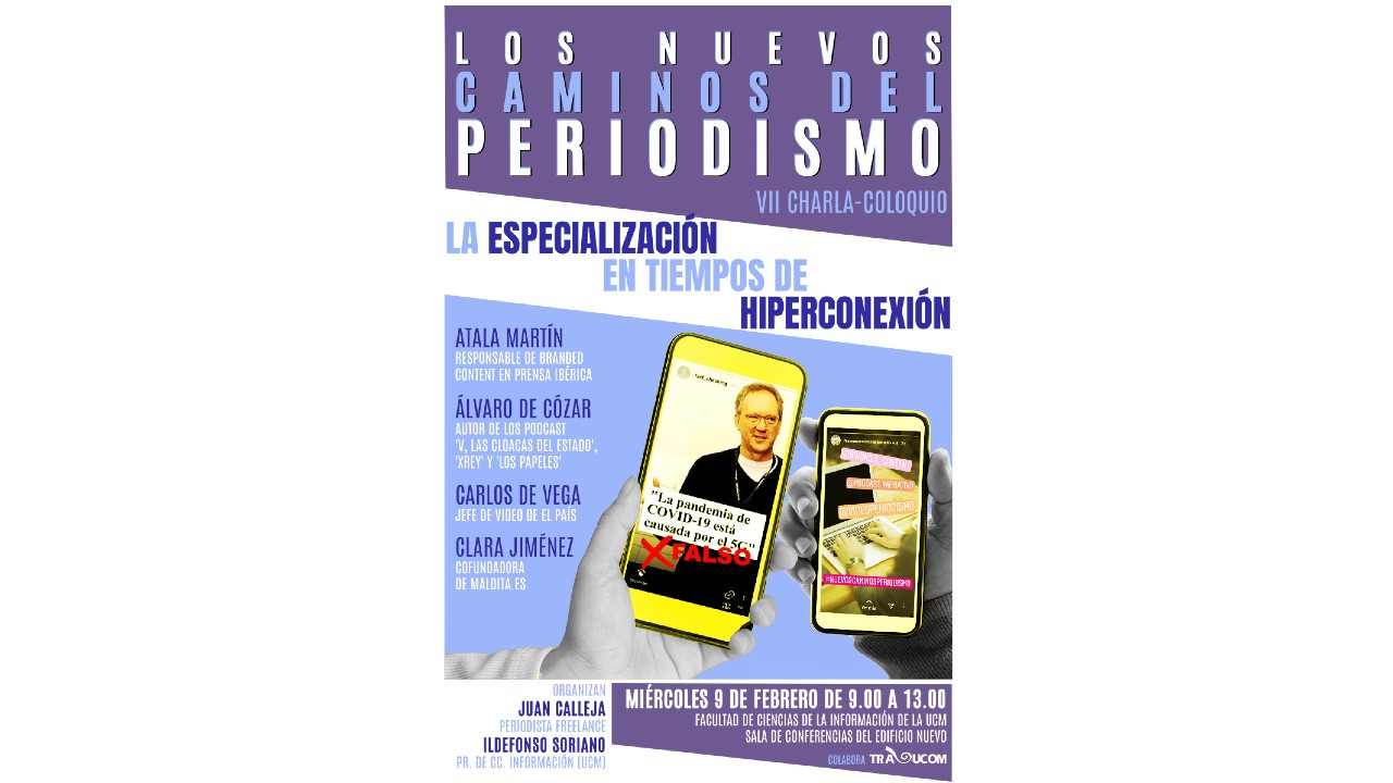 En esta séptima edición, que lleva por título ‘La especialización en tiempos de hiperconexión’, participan los periodistas Atala Martín (responsable de branded content en Prensa Ibérica), Carlos de Vega (jefe de vídeo de El País), Álvaro de Cózar (autor de los podcast ‘V, las cloacas del estado’, ‘Xrey’ y ‘Los Papeles’) y Clara Jiménez (cofundadora de Maldita.es).
