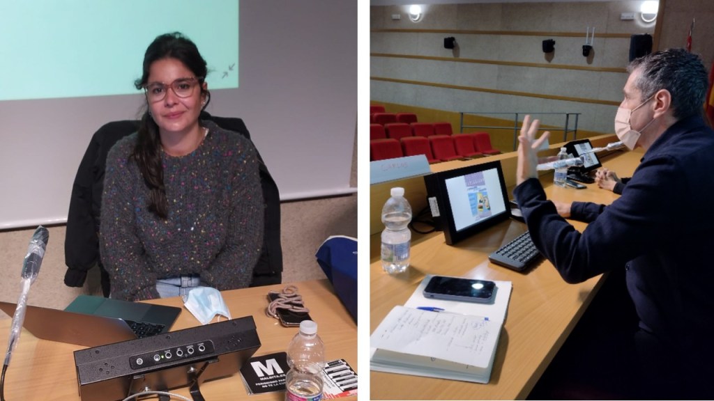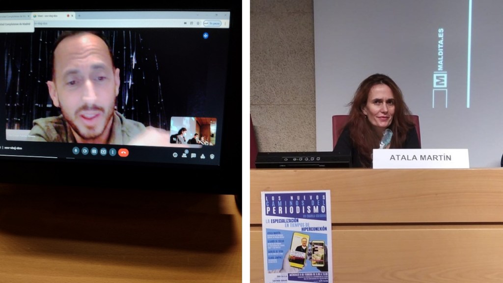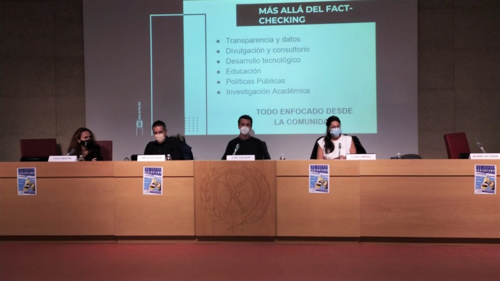 “Todos empezamos la carrera queriendo ser Iñaki Gabilondo, Àngels Barceló o poned el periodista famoso que queráis, pero realmente hay tres. O queremos firmar en la portada del periódico y presentar el programa de las nueve de la noche. Hay vida mucho más allá”, subrayó durante su intervención Clara Jiménez, cofundadora de Maldita.es, medio digital de verificación de hechos pionero en España y cuyo lema es “periodismo para que no te la cuelen”. La joven periodista relató a los estudiantes que asistieron presencialmente y a los que siguieron la jornada en streaming cuál había sido su camino hasta crear un medio de comunicación propio, previo paso por cadenas de televisión como Intereconomía o La Sexta.