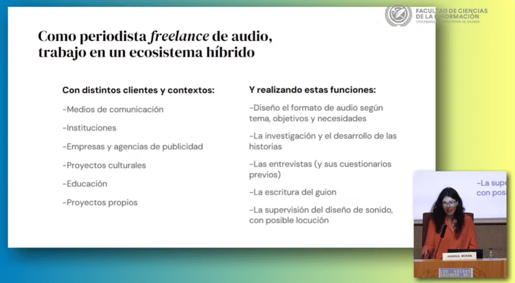 Al final de su ponencia, explicó cuáles son las fases a la hora de crear una historia periodística en formato pódcast y también habló de su faceta como freelance del audio desde 2025, describiendo quiénes son sus clientes y cómo trabaja con ellos.