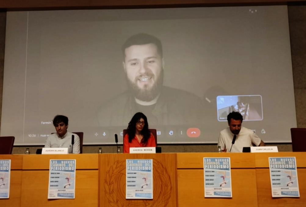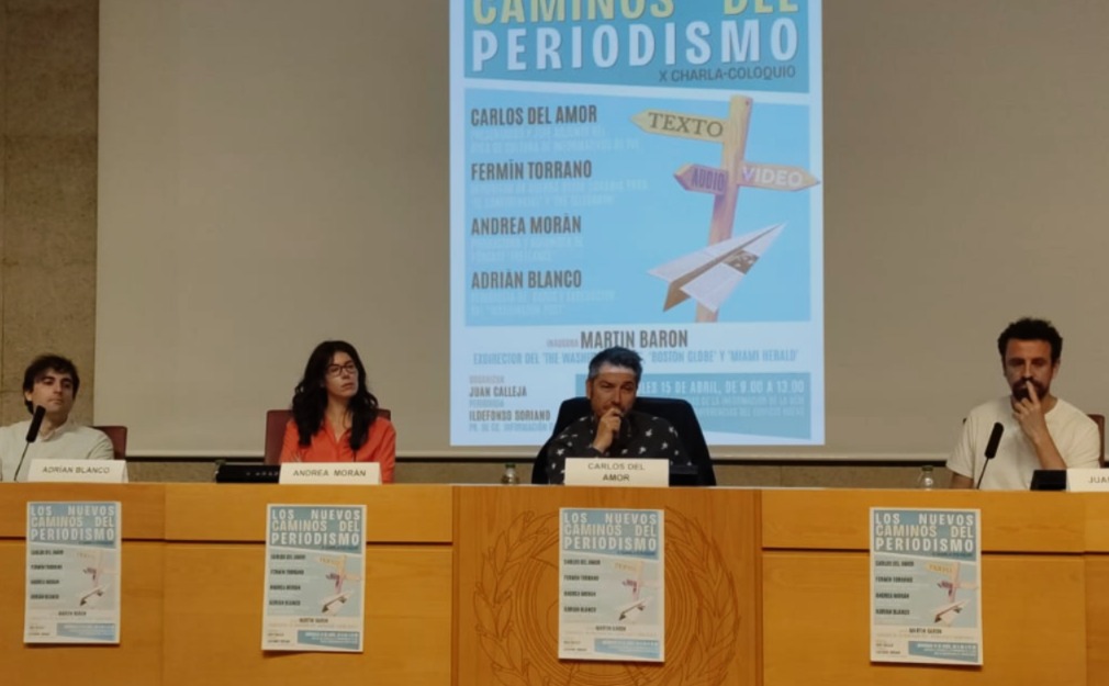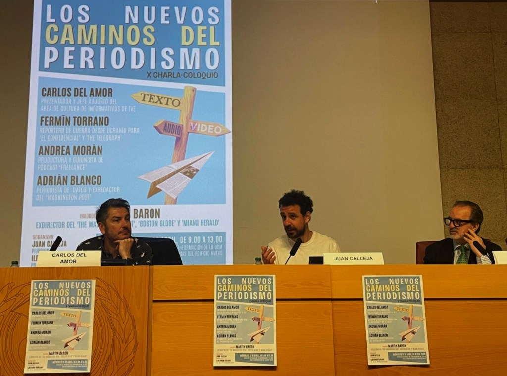 En una sala de conferencias del edificio nuevo de la conocida como “facultad gris” con pocos alumnos en el arranque de la jornada pero que con el paso de la mañana se fue animando con grupos de estudiantes que entraban y salían -también asistieron estudiantes y profesionales externos a la facultad-, los periodistas Carlos del Amor (RTVE), Fermín Torrano (reportero de guerra desde Ucrania para El Confidencial y The Telegraph), Andrea Morán (guionista y productora freelance de pódcast narrativo) y Adrián Blanco (periodista de datos y exredactor del The Washington Post) detallaron sus trayectorias profesionales y compartieron con generosidad claves y su día a día en el oficio de informar en su área o disciplina laboral.
